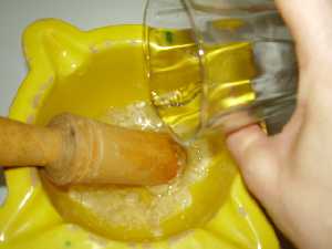 Para ello ponemos en un mortero la cabeza de ajos y la picamos, ayudándonos con una pizca de sal para evitar que salten. Una vez picaditos los ajos añadimos el vaso de vinagre y mezclamos.